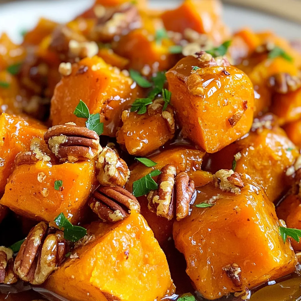 - 4 medium sweet potatoes, peeled and cut into bite-sized cubes - 1/2 cup pecans, coarsely chopped - 1/4 cup pure maple syrup - 3 tablespoons unsalted butter, melted - 1 teaspoon ground cinnamon - 1/2 teaspoon ground nutmeg - Salt and freshly ground black pepper, to taste - Fresh parsley, chopped (for garnish, optional) Sweet potatoes are the star here. They bring a sweet, earthy taste. Pecans add a nice crunch and nutty flavor. Pure maple syrup gives a rich sweetness. Unsalted butter helps to coat the sweet potatoes. Ground cinnamon and nutmeg add warmth and spice. Using salt and pepper balances the flavors. Fresh parsley brightens the dish and adds color. When choosing sweet potatoes, look for firm ones with smooth skin. Avoid any with soft spots or blemishes. For pecans, fresh nuts have a better taste. Check for a rich smell without any off odors. Pure maple syrup should be your first choice for the best flavor. Avoid imitation syrups, as they lack depth. Fresh spices, like cinnamon and nutmeg, provide the best flavor. Check expiration dates to ensure quality. First, preheat your oven to 400°F (200°C). This step is key for perfect roasting. Next, take four medium sweet potatoes. Peel them and cut them into bite-sized cubes. You want them even for cooking. Bring a large pot of salted water to a boil. Carefully add the sweet potato cubes to the boiling water. Cook for about 10-15 minutes or until they are fork-tender. Drain the potatoes well and let them cool slightly in a bowl. In a separate mixing bowl, combine 3 tablespoons of melted butter and 1/4 cup of pure maple syrup. Add 1 teaspoon of ground cinnamon and 1/2 teaspoon of ground nutmeg. Don't forget a pinch of salt and a few cracks of black pepper. Mix these ingredients until smooth. Now, gently fold the sweet potato cubes into the maple mixture. Make sure each piece is coated well, but be careful not to mash them. Line a baking sheet with parchment paper to prevent sticking. Spread the sweet potatoes evenly on the sheet in a single layer. This helps them roast properly. Now, sprinkle 1/2 cup of coarsely chopped pecans over the sweet potatoes. This adds great flavor and crunch. Place the baking sheet in your preheated oven. Roast the sweet potatoes for about 25-30 minutes. Remember to stir them halfway through cooking. This helps them caramelize evenly and gives them a nice golden color. Once the sweet potatoes are done, take them out of the oven and let them cool slightly. This resting time lets all the flavors develop. For a beautiful presentation, you can garnish the dish with fresh parsley if you like. This adds color and freshness to your dish. Serve the sweet potatoes in a rustic bowl or on a decorative platter. Drizzle any leftover maple mixture from the baking sheet over the top. It makes for a sweet and shiny finish that everyone will love. To get the best results, roast the sweet potatoes at 400°F (200°C). This heat gives a nice caramelization. Boil the sweet potatoes first. This step makes them tender. When you mix them with the maple syrup, they coat better. Spread the sweet potatoes on the baking sheet. Avoid crowding them, so they roast evenly. Stir them halfway through cooking. This helps them brown on all sides. Maple syrup adds sweetness, but you can boost the flavor more. Try adding a pinch of cayenne for warmth. A dash of vanilla extract gives a nice twist too. You can also mix in other spices. Cardamom or ginger pairs well with sweet potatoes. Don’t forget the salt and pepper. They balance the dish perfectly. Presentation is key for any dish. Serve the sweet potatoes in a rustic bowl. A decorative platter also works well. Drizzle the leftover maple mixture from the baking sheet over the potatoes. It adds shine and extra sweetness. For a pop of color, sprinkle fresh parsley on top. This makes the dish look fresh and inviting. {{image_4}} You can change the sweet taste of this dish. If you want less sugar, try using honey or agave syrup. Both add great flavor. You can also use coconut sugar for a richer taste. Each option gives a unique twist to your sweet potatoes. While pecans are tasty, other nuts work well too. Walnuts or almonds can add crunch and flavor. If you like spice, consider adding ginger or allspice. These can give your dish a warm, cozy feel. Experiment with different nuts and spices to find your favorite mix. To make this dish vegan, swap the butter for coconut oil or vegan butter. This keeps it creamy and rich. For gluten-free, you can rest easy. All the ingredients are already gluten-free. Enjoy this dish without worry, and it will still taste amazing! After enjoying your Maple Pecan Sweet Potatoes, store any leftovers in an airtight container. Keep them in the fridge for up to four days. This helps preserve their taste and texture. Make sure they cool to room temperature before sealing. This step helps prevent moisture buildup, which can make them soggy. To reheat your sweet potatoes, preheat your oven to 350°F (175°C). Spread the sweet potatoes on a baking sheet. Heat them for 15-20 minutes, or until warm. Stir halfway through to ensure even heating. If you prefer the microwave, place a portion in a bowl. Heat for 1-2 minutes, stirring once. If you want to freeze your sweet potatoes, first let them cool completely. Place them in a freezer-safe bag or container. Remove as much air as possible to prevent freezer burn. They can stay fresh in the freezer for up to three months. To enjoy later, just thaw in the fridge overnight before reheating. You can prepare Maple Pecan Sweet Potatoes a day before serving. First, cook the sweet potatoes and mix them with the maple mixture. Place them in a baking dish and cover tightly with foil. Store in the fridge overnight. When you are ready to serve, just bake them in the oven. You may need to adjust the baking time if they are cold from the fridge. Yes, you can use other nuts. Walnuts or almonds work well. Each nut gives a different flavor. Just ch