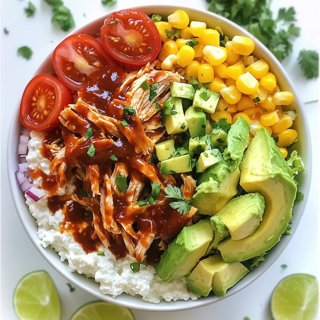 Here is the list of ingredients you will need for the BBQ Chicken Cottage Cheese Bowl: - 2 cups cooked chicken breast, shredded - 1 cup BBQ sauce - 2 cups cottage cheese - 1 cup cherry tomatoes, halved - 1 ripe avocado, diced - 1 cup corn kernels - 1/2 red onion, thinly sliced - 1 cup shredded lettuce - 1/4 cup fresh cilantro, chopped (optional) - Salt and pepper to taste - Lime wedges for garnish Each ingredient plays a key role in creating a tasty and filling meal. The shredded chicken adds protein. The BBQ sauce brings a sweet and smoky flavor. Cottage cheese gives a creamy base, while fresh veggies add crunch and color. You can adjust the toppings to fit your taste. This dish is great for lunch or dinner. {{ingredient_image_2}} To start, I heat the shredded chicken in a medium saucepan. I pour in 1 cup of BBQ sauce. I stir well to coat the chicken evenly. Over medium heat, I warm the mixture for about 5 minutes. The chicken should be hot but not overcooked. This step adds that rich BBQ flavor, making it perfect for our bowl. Next, I prepare the base of our bowl. I take 2 cups of cottage cheese and spoon it into a large serving bowl. I spread it out evenly across the bottom. This smooth layer is key. It gives a nice contrast to the warm chicken on top and adds creaminess to each bite. Now, it’s time to layer the toppings. I carefully add the heated BBQ chicken over the cottage cheese. I make sure to spread it evenly so every spoonful has chicken. Then, I add the fresh toppings: halved cherry tomatoes, corn kernels, diced avocado, thinly sliced red onion, and shredded lettuce. I try to arrange these toppings in a colorful way. This makes the dish look tasty and inviting. Finally, I season the bowl with salt and pepper to taste. If I want to add a fresh touch, I sprinkle chopped cilantro on top. This adds color and flavor. I serve the bowl right away, with lime wedges on the side. I encourage everyone to squeeze the lime over their meal. It adds a zesty kick that makes this dish truly shine. To really get that BBQ taste, pick a sauce you love. I suggest using a sweet and smoky sauce. Brands like Sweet Baby Ray's or Stubb's have great options. For a homemade twist, mix ketchup, brown sugar, and apple cider vinegar. This combo gives a nice blend of sweet and tangy flavors. When serving, be sure to use colorful bowls. This makes the dish pop! Place lime wedges in a small dish at the center of the table. It gives easy access for a zesty squeeze. Arrange the toppings in layers for a beautiful look. This way, each bite is a mix of all flavors. Want to take it up a notch? Add crunchy toppings like tortilla strips or crushed nuts. They add a fun texture. You can also try adding jalapeños for a spicy kick. If you love cheese, sprinkle some shredded cheddar on top. These extras make the dish even more exciting! Pro Tips Use Homemade BBQ Sauce: Making your own BBQ sauce allows you to customize the flavors to your liking, ensuring a personal touch to your dish. Perfect Avocado Ripeness: Choose avocados that are slightly soft to the touch but not mushy; this will ensure they are creamy and flavorful for your bowl. Fresh Ingredients Matter: Using fresh vegetables like cherry tomatoes and lettuce not only enhances the flavor but also adds a vibrant color to your dish. Customize Your Bowl: Feel free to add additional toppings like black beans, jalapeños, or shredded cheese to suit your taste preferences. {{image_4}} You can switch the chicken for many other proteins. Try shredded pork or tofu for a fun twist. Each option brings a new flavor and texture. If you want a lighter dish, grilled shrimp works great too. For a vegetarian version, mix in black beans or chickpeas. They add protein and keep it filling. You can also change the toppings. Use diced bell peppers or olives for different tastes. The key is to match your favorites with the BBQ sauce. If you need to make this dish gluten-free, check the BBQ sauce. Some brands add gluten, so look for gluten-free labels. You can also use homemade sauce to control the ingredients. To make it dairy-free, swap cottage cheese for a dairy-free alternative. Look for brands that use nuts or soy. You can also use avocado for a creamy base. These small changes make the dish fit your needs while keeping it tasty. This dish is perfect for meal prep. You can make it ahead for easy lunches or dinners. Cook the chicken and mix it with the BBQ sauce. Then store it in a container. Keep the cottage cheese and toppings separate. This keeps everything fresh and prevents sogginess. When you're ready to eat, just layer the cottage cheese first. Add the chicken and top it with your chosen toppings. It takes just a few minutes to prepare. This meal prep makes your week easier and more delicious. To keep your BBQ chicken cottage cheese bowl fresh, refrigerate leftovers right away. Place the bowl in an airtight container. Make sure the lid seals tightly. This helps keep moisture in and air out. Leftovers should stay good for up to three days. When ready to enjoy your leftovers, use a microwave for quick reheating. Place the bowl in the microwave and cover it with a damp paper towel. Heat for one to two minutes until warm. Stir halfway through to ensure even heating. You can also reheat on the stove. Just add a splash of water to a pan, then heat over low heat. Stir it until hot, about five minutes. If you want to freeze this dish, it's best to do it right after making it. Store the bowl in a freezer-safe container. Leave a little space at the top for expansion. This dish can freeze for up to three months. To thaw, move it to the fridge overnight. Once thawed, reheat as mentioned above. This will help keep the flavors rich and tasty. Yes, you can use canned chicken. It saves time and works well in this dish. Just drain it before using. The taste is still good with BBQ sauce. Mix it in with the sauce just like fresh chicken. Canned chicken adds convenience to your meal prep. If y