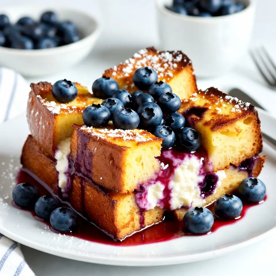 A delightful casserole combining the flavors of blueberry cheesecake and French toast, perfect for brunch.