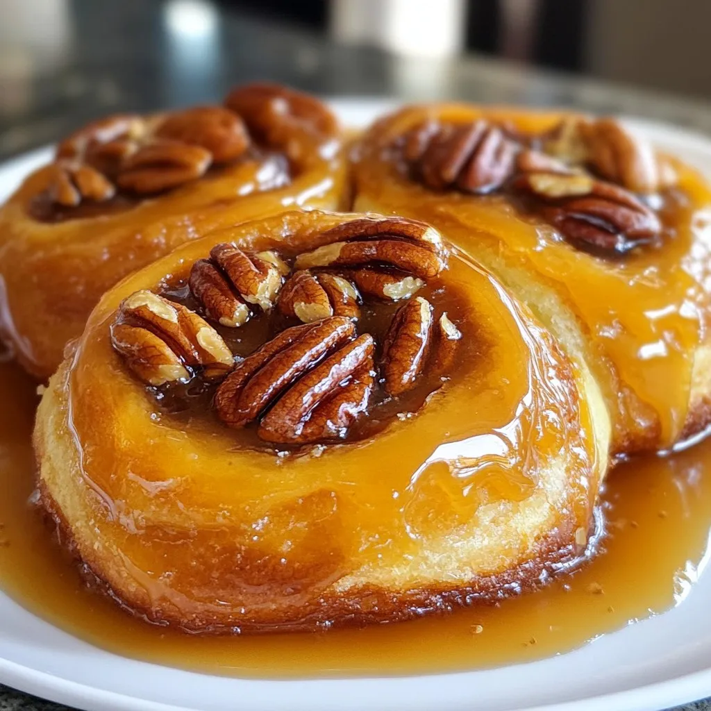 Deliciously sticky buns filled with caramel and pecans, perfect for a sweet breakfast or dessert.