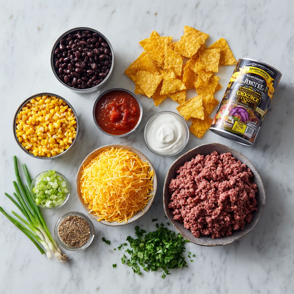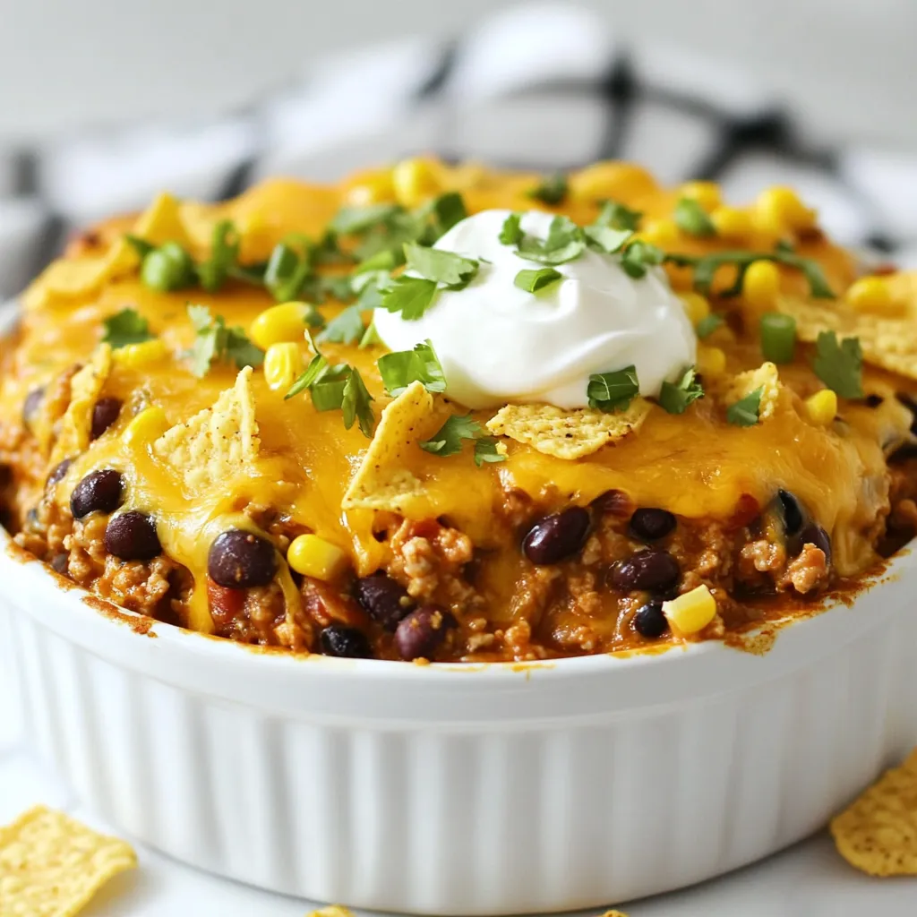 A delicious and hearty casserole layered with seasoned meat, beans, corn, and cheese, topped with crispy tortilla chips.
