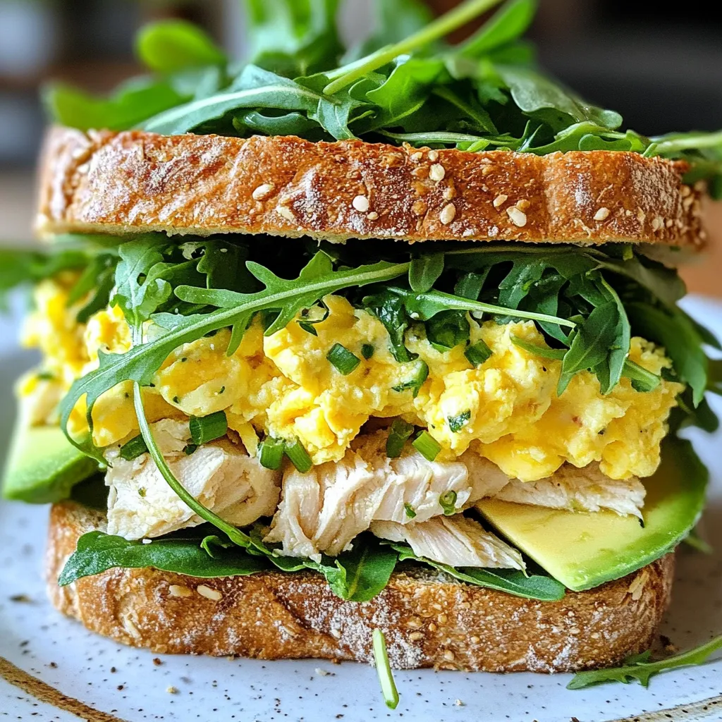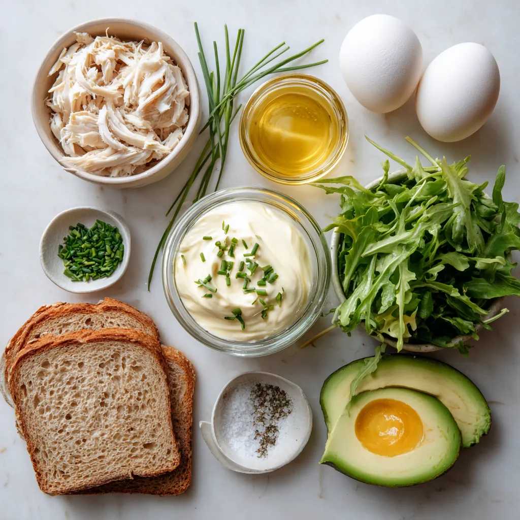 The main ingredients create a tasty sandwich. The shredded chicken gives it protein and flavor. Eggs add fluffiness and richness to each bite. Mayonnaise and Dijon mustard bring creaminess and a zing that makes it special. Fresh chives add a nice hint of onion. Olive oil gives a little extra taste when cooking the eggs. Whole grain bread adds fiber and texture. The avocado slices make it creamy, while leafy greens add freshness.