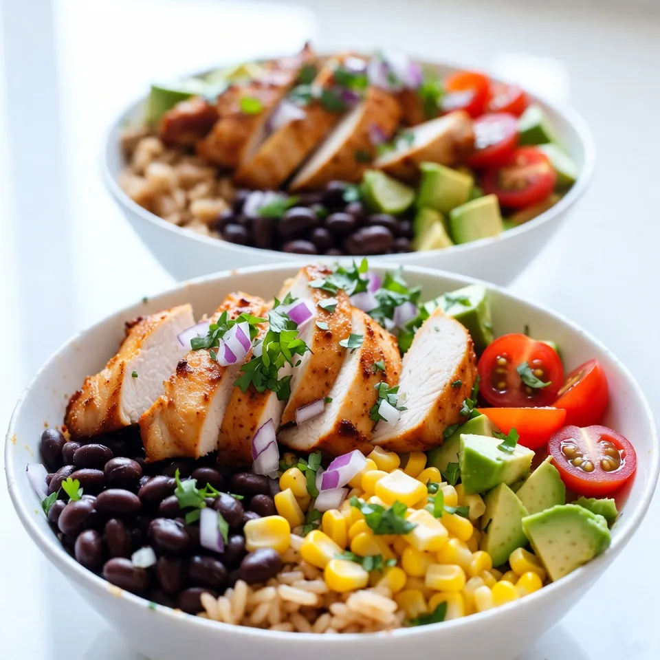 A flavorful and nutritious bowl featuring marinated chicken, rice or quinoa, and fresh toppings.