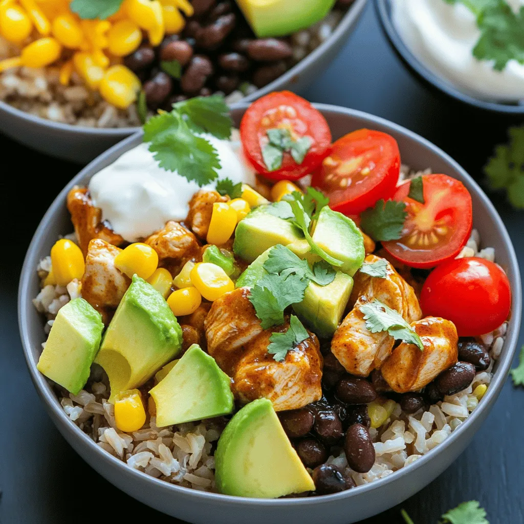 It’s time to build your burrito bowls! In individual serving bowls, start with a base of fluffy brown rice. Layer on the sautéed chicken, black beans, bell pepper, and corn. Add halved cherry tomatoes and diced avocado on top. This creates a colorful and tasty dish.
