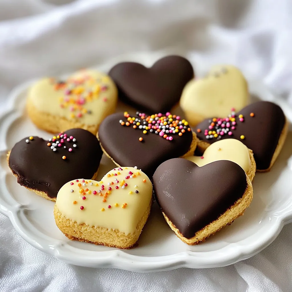 Delicious shortbread cookies shaped like hearts, dipped in chocolate and optionally garnished with sprinkles or nuts.