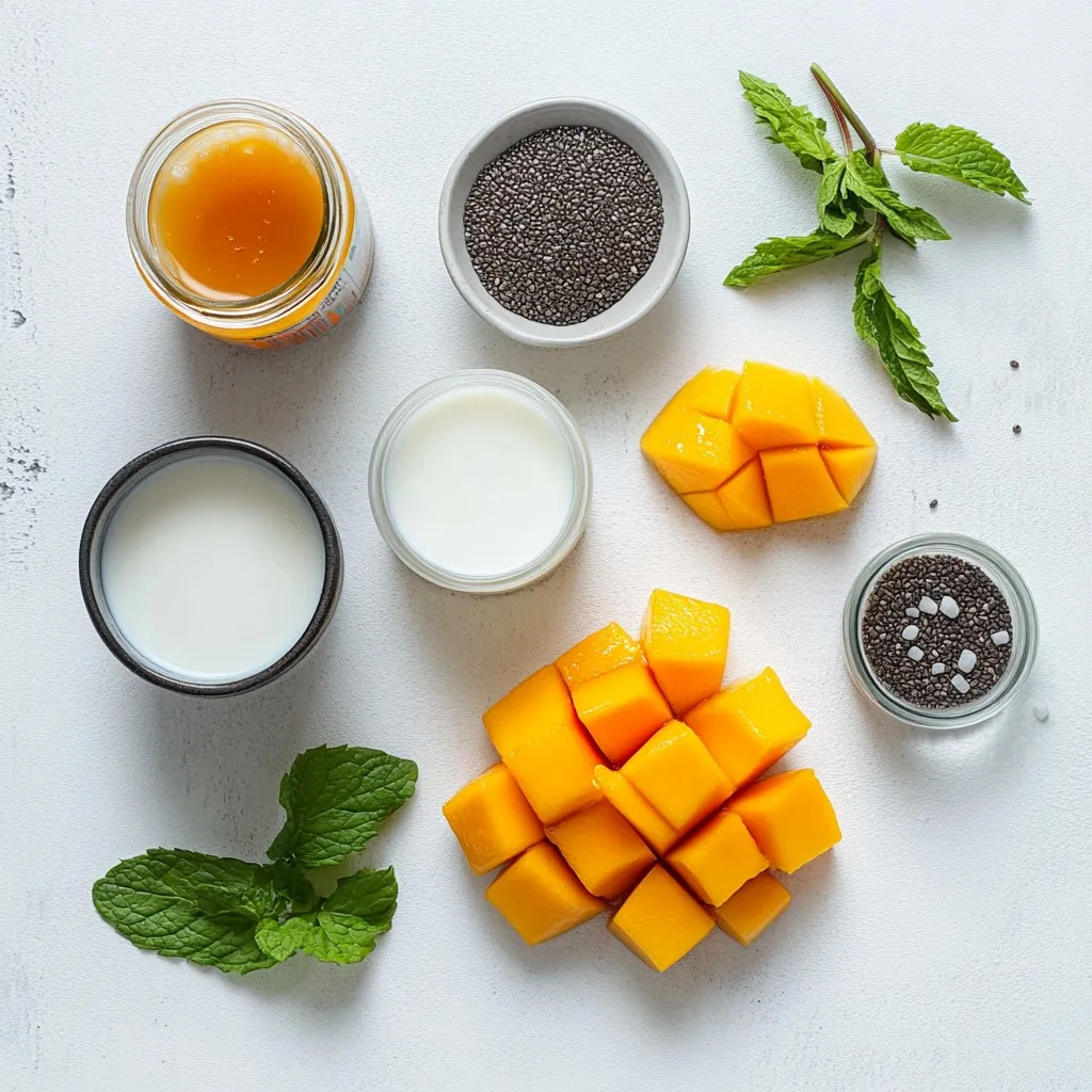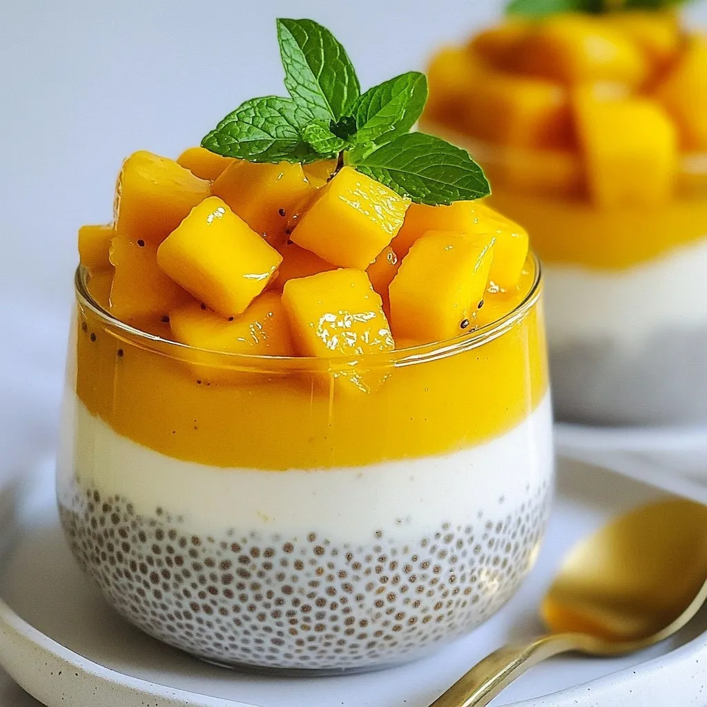 - 1 cup coconut milk (canned or carton) - 1/2 cup almond milk (or your choice of plant-based milk) - 1/4 cup chia seeds - 2 tablespoons honey or maple syrup (adjust to taste) - 1 ripe mango, diced into small cubes - 1/2 teaspoon vanilla extract - A pinch of salt - Fresh mint leaves for garnish Coconut milk and almond milk are both great for this recipe. Coconut milk gives a rich taste. Almond milk adds a light flavor. You can mix them, too, for a creamy effect. When choosing sweeteners, honey and maple syrup both work well. Honey is thicker and adds a floral taste. Maple syrup is more liquid and has a unique flavor. You can pick what you like best. For fresh mango, look for ripe ones. They should feel slightly soft when you press them. A bright yellow or orange color shows ripeness. Avoid ones with dark spots, as they may be overripe. Using these fresh ingredients makes your pudding delicious and healthy. Enjoy crafting this tropical treat! {{ingredient_image_2}} In a medium bowl, combine 1 cup of coconut milk and 1/2 cup of almond milk. You can use canned or carton coconut milk, whichever you prefer. Next, add 2 tablespoons of honey or maple syrup. Adjust this to your taste. Then, drop in 1/2 teaspoon of vanilla extract and a pinch of salt. Whisk everything together until it is creamy and well blended. Now, take 1/4 cup of chia seeds. Gradually sprinkle them into your milk mixture while stirring continuously. This step is key to avoiding clumps. Stir well to ensure even distribution of the seeds. If you see clumps, keep stirring! Cover the bowl with plastic wrap or a lid. Place it in the refrigerator. Chill for at least 4 hours, but overnight is best. This time allows the chia seeds to soak up the liquid and grow. The pudding will thicken up nicely. Once ready, remove the bowl from the fridge. Stir the pudding well to mix it again. This helps to get a smooth texture. Now, grab your serving bowls or clear jars. Start with a layer of chia pudding, then add a layer of diced mango on top. Repeat this process, finishing with mango. This creates a beautiful effect. For the final touch, add a few fresh mint leaves on top of each serving. This not only looks great but adds a fresh aroma. You can even add a slice of mango on top for a pop of color. Enjoy your Coconut Mango Chia Pudding! To store leftovers, place the pudding in an airtight container. Keep it in the fridge for up to four days. This way, the pudding stays fresh and tasty. If you notice any separation, just stir it before serving. You can tailor the sweetness to your taste. Start with two tablespoons of honey or maple syrup. Taste it, then decide if you want more. You can easily add a little more sweetener if you like. Remember, ripe mangoes add natural sweetness too! If your pudding is too thick, add a splash of almond milk. Stir it in well until you reach the desired creaminess. If it’s too runny, let it chill longer. The chia seeds need time to absorb the liquid. If you see lumps, it means the chia seeds clumped together. Stir the mixture well before chilling to avoid this. Pro Tips Perfect Consistency: To achieve the ideal thickness, ensure that you allow the chia pudding to chill for at least 4 hours, preferably overnight. This ensures the chia seeds fully absorb the liquid. Flavor Variations: Experiment with different plant-based milks or sweeteners. Coconut milk pairs beautifully with other fruits like pineapple or banana for a tropical twist. Presentation Matters: Serve the pudding in clear jars or glasses to showcase the stunning layers of mango and pudding. This not only looks appealing but also enhances the eating experience. Fresh Garnish: Always add fresh mint leaves just before serving. They not only add a pop of color but also a refreshing aroma that complements the flavors of the pudding. {{image_4}} You can add many fruits or spices to your pudding. Some great options include: - Berries: Strawberries, blueberries, or raspberries add a sweet and tart flavor. - Bananas: Mashed bananas give a creamy texture and natural sweetness. - Cinnamon: A sprinkle adds warmth and a nice twist to the taste. - Coconut Flakes: Shredded coconut can boost the coconut flavor and add texture. Try different combinations to find your favorite! If you want to change the milk, many plant-based options work well. Here are some choices: - Soy Milk: This milk is creamy and rich in protein. - Oat Milk: It has a mild taste and adds a nice texture. - Cashew Milk: Creamy and slightly sweet, it pairs well with mango. - Rice Milk: A lighter option that is naturally sweet. Feel free to experiment with what you have at home! You might want to change the sweetener. Here are some substitutes to consider: - Agave Nectar: A sweet syrup that blends easily into the mixture. - Coconut Sugar: This adds a caramel-like flavor to the pudding. - Stevia: A no-calorie sweetener if you want to cut sugar. - Brown Rice Syrup: A thick syrup that adds a unique taste. These swaps can help you customize the sweetness to match your taste! Chia seeds are tiny but mighty. They are packed with fiber, protein, and healthy fats. Just two tablespoons give you about 5 grams of protein. This helps keep you full longer. Chia seeds also contain omega-3 fatty acids. These support heart health and brain function. Coconut milk adds creaminess and a tropical flavor. It is rich in medium-chain triglycerides (MCTs), which may boost energy. This milk also provides vitamins and minerals, like potassium and magnesium. Mango is not just delicious; it is also full of vitamins. One mango has vitamin C, which helps your immune system. They also contain vitamin A, which is good for your eyes. Each serving of coconut mango chia pudding has about 200 calories. This varies with your choice of sweetener and milk. Here’s a simple breakdown: - Coconut milk (1 cup): ~445 calories - Almond milk (1/2 cup): ~15 calories - Chia seeds (1/4 cup): ~180 calories - Honey (2 tablespoons): ~128 calories or mapl
