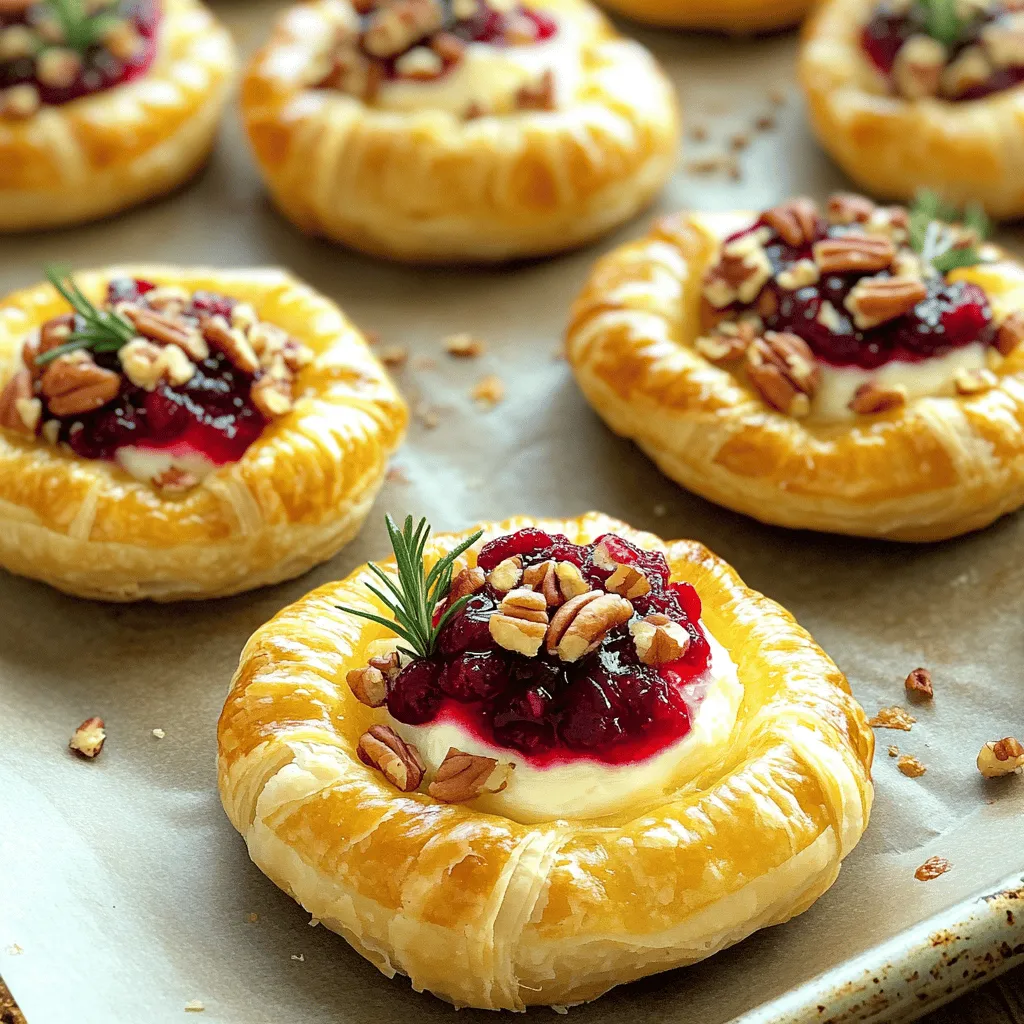 ![- Puff pastry - Brie cheese - Cranberry sauce - Chopped pecans or walnuts - Fresh herbs for garnish - Salt and freshly cracked pepper - Egg for egg wash Cranberry brie bites are easy to make and need just a few key ingredients. The puff pastry serves as a light and flaky base. Brie cheese adds creaminess and a rich flavor. The cranberry sauce brings a sweet-tart twist that brightens the dish. You can use store-bought sauce or make your own if you prefer. Adding nuts like pecans or walnuts gives a nice crunch to the bites. Fresh herbs such as rosemary or thyme add a pop of color and flavor. Seasoning is simple with just salt and pepper. The egg wash helps the pastry turn golden and shiny as it bakes. Using these ingredients, you can create a dish that impresses friends and family. For a detailed guide, check out the Full Recipe. 1. Preheat your oven to 375°F (190°C). This step helps the bites cook evenly. 2. Line a baking sheet with parchment paper. This makes cleanup easy. 3. Lightly flour your work surface. This keeps the pastry from sticking. 4. Roll out the thawed puff pastry. Smooth out any creases gently. 5. Cut the pastry into 3-inch squares using a sharp knife or pizza cutter. You’ll have about 20 squares. 1. Place each pastry square on the baking sheet. Leave space between them. 2. In the center of each square, add a small piece of brie cheese. Aim for about 1 teaspoon. 3. Top the brie with a generous dollop of cranberry sauce. This adds sweetness and flavor. 4. If you want a crunch, sprinkle chopped pecans or walnuts over the cranberry sauce. 5. Fold the corners of each pastry square towards the center. Pinch the corners together to form a pocket. 1. Brush the tops of the pastry pockets with the beaten egg. This gives them a golden color. 2. Place the baking sheet in the oven. Bake for 15-20 minutes. The bites should puff up and turn golden brown. 3. Once baked, take them out and let them cool slightly. 4. For a nice finish, garnish with fresh rosemary or thyme. Add a sprinkle of salt and pepper if you like. 5. Serve warm and enjoy these savory bites with friends and family! For the full recipe, check out the [Full Recipe]. You can make your cranberry sauce a day before. This saves time and lets the flavors blend. Store it in an airtight container in the fridge. You can also assemble the bites ahead of time. Just keep them in the fridge before baking. Cover them with plastic wrap to avoid drying out. Ovens can vary, so check your bites as they bake. Start with 15 minutes and watch for a golden color. If they need more time, add a few minutes. Keep an eye on them to avoid burning. A perfectly baked bite has a puffy, golden crust. These bites pair well with drinks like sparkling wine or cider. For sides, try a fresh salad or a cheese board. To impress guests, arrange the bites on a nice platter. Add herbs for color and serve extra cranberry sauce on the side. This adds a fun dipping option! For the full recipe, check out the Cranberry Brie Bites with a Sweet Twist section. {{image_4}} You can easily boost the taste of your cranberry brie bites. Consider adding spices like cinnamon or nutmeg for a warm twist. These spices blend well with the sweetness of cranberry. You might also try different cheeses. Gouda or goat cheese can create a unique flavor. Each cheese adds its own character to the bites. If you need gluten-free options, use an alternative pastry such as almond flour dough. It works just as well and keeps things tasty. For those on a vegan diet, plant-based cheese is a great choice. There are many brands that melt nicely and taste good. You can still enjoy the joy of these bites without dairy or gluten. Seasonal fruits can replace cranberries for a fresh take. Try using apples or pears in the fall. These fruits add a crisp texture and sweet flavor. For holiday-themed variations, think about adding festive toppings. A sprinkle of pomegranate seeds or a drizzle of honey can make them stand out. These small changes create a special treat for any occasion. You can find the full recipe for cranberry brie bites in our main section. After enjoying your cranberry brie bites, store any leftovers in the fridge. Use an airtight container to keep them fresh. They will last about 2-3 days in the fridge. You can freeze these bites before or after baking. If freezing before baking, assemble the bites and place them on a baking sheet. Freeze until firm, then transfer them to an airtight container. They can stay frozen for up to 3 months. For baked bites, let them cool completely before freezing. To reheat, place them in a preheated oven at 350°F (175°C) for about 10-15 minutes, until warm and crispy. To keep your pastry crispy, store the bites in a dry place. Avoid stacking them too closely. Use a container that allows air flow, like a wire rack or a paper bag. This helps prevent moisture buildup. When reheating, use an oven instead of a microwave to maintain that nice crunch. Yes, you can make cranberry brie bites ahead of time. You can prepare the bites and freeze them before baking. To do this, follow these steps: - Assemble the bites but do not bake them. - Place them on a baking sheet and freeze for about one hour. - Once frozen, transfer them to a freezer bag. - When you are ready to bake, just take them out and bake directly from the freezer. If you need an alternative to brie, there are several great options. You can try: - Camembert for a similar creamy texture. - Goat cheese for a tangy flavor. - Cream cheese for a milder taste. These substitutes can change the flavor, so choose what you like best. To keep the pastry nice and crispy, follow these tips: - Use a good-quality puff pastry. - Avoid overfilling the pastry with sauce. - Bake them right after assembling for the best texture. - Place them on a preheated baking sheet to help with crispiness. These steps will help keep your bites golden and crunchy! In this post, we explored how to make delicious cranberry brie bi