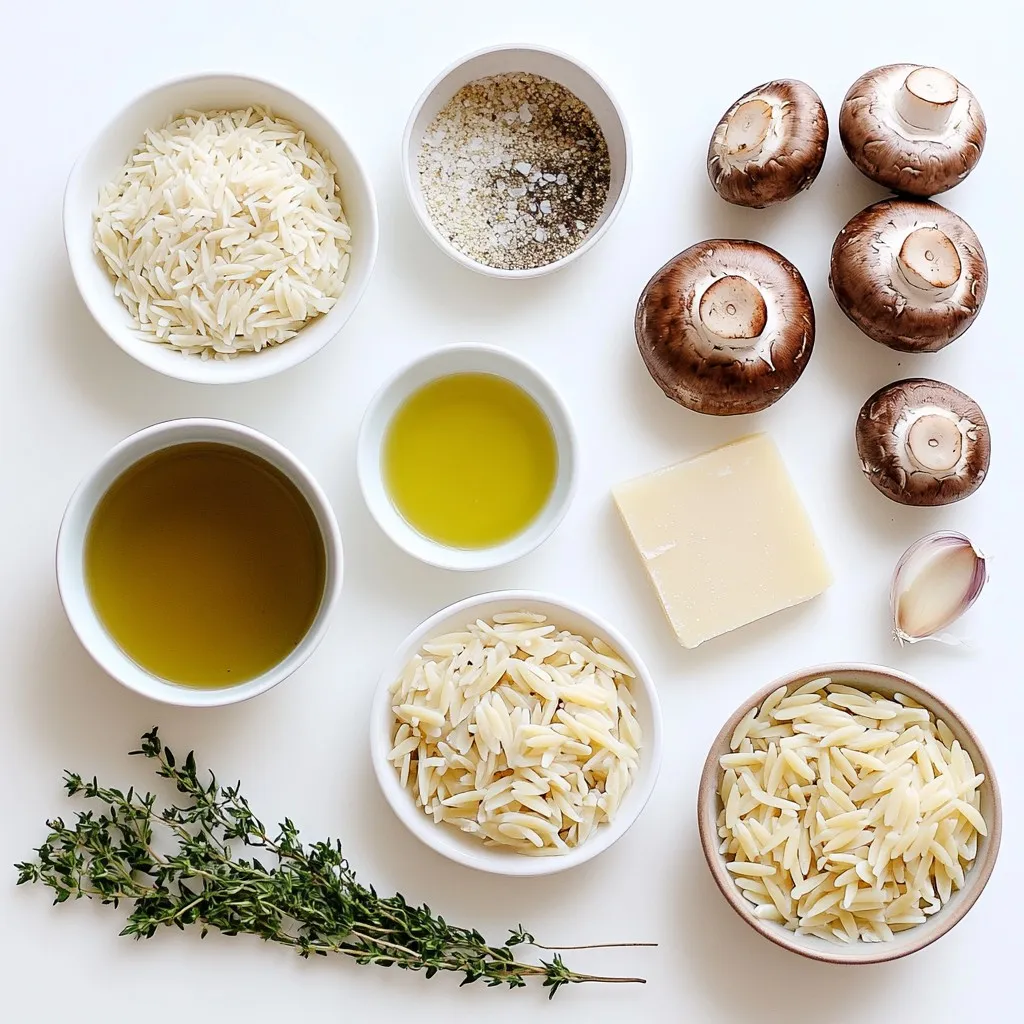 To make creamy mushroom orzo, start by gathering your ingredients. You need orzo, olive oil, onion, garlic, mushrooms, broth, cream, Parmesan cheese, thyme, salt, and pepper.