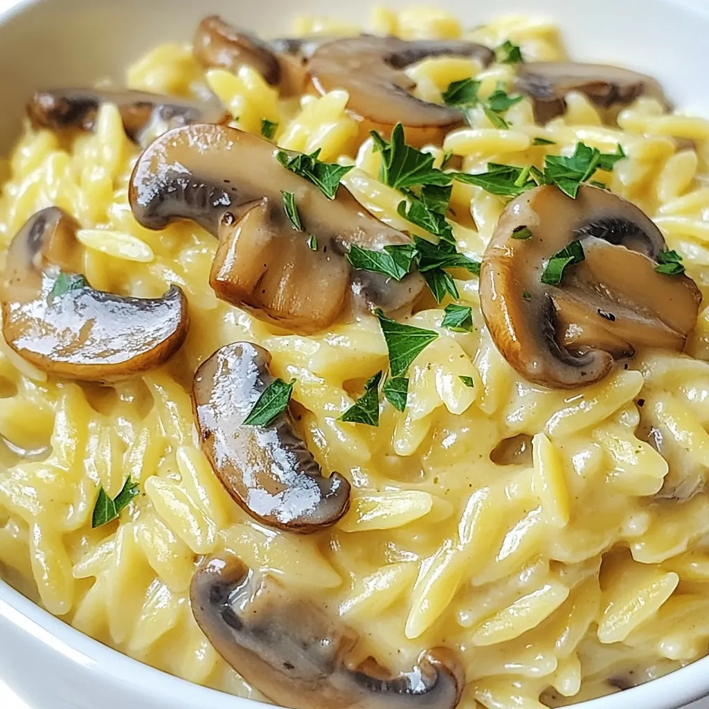 A comforting and creamy dish featuring orzo pasta and sautéed mushrooms, perfect for a cozy meal.