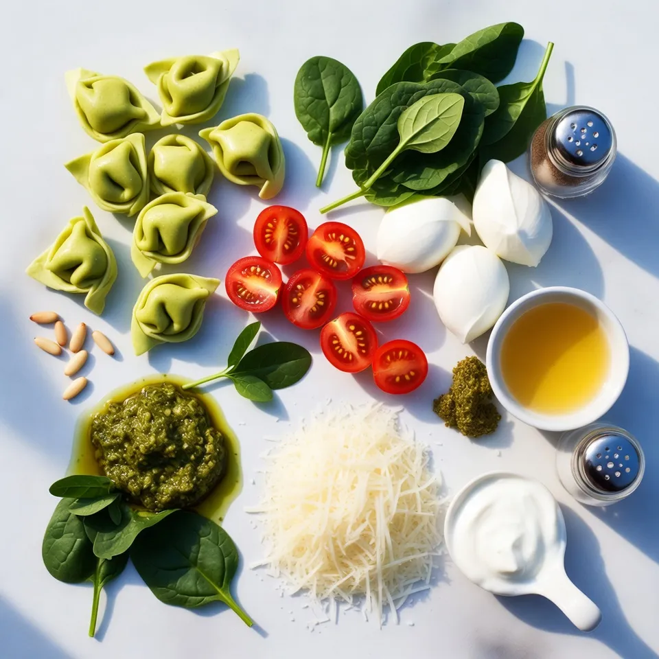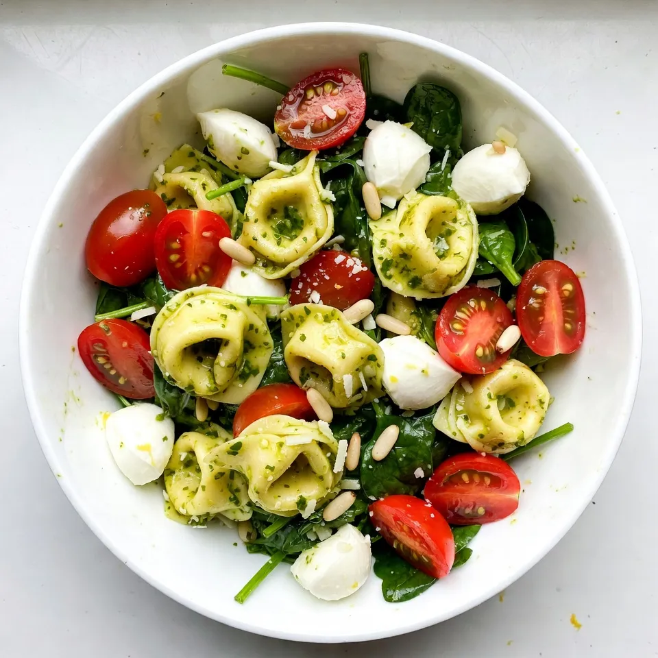 A refreshing salad featuring cheese tortellini, cherry tomatoes, spinach, and a creamy basil pesto dressing.