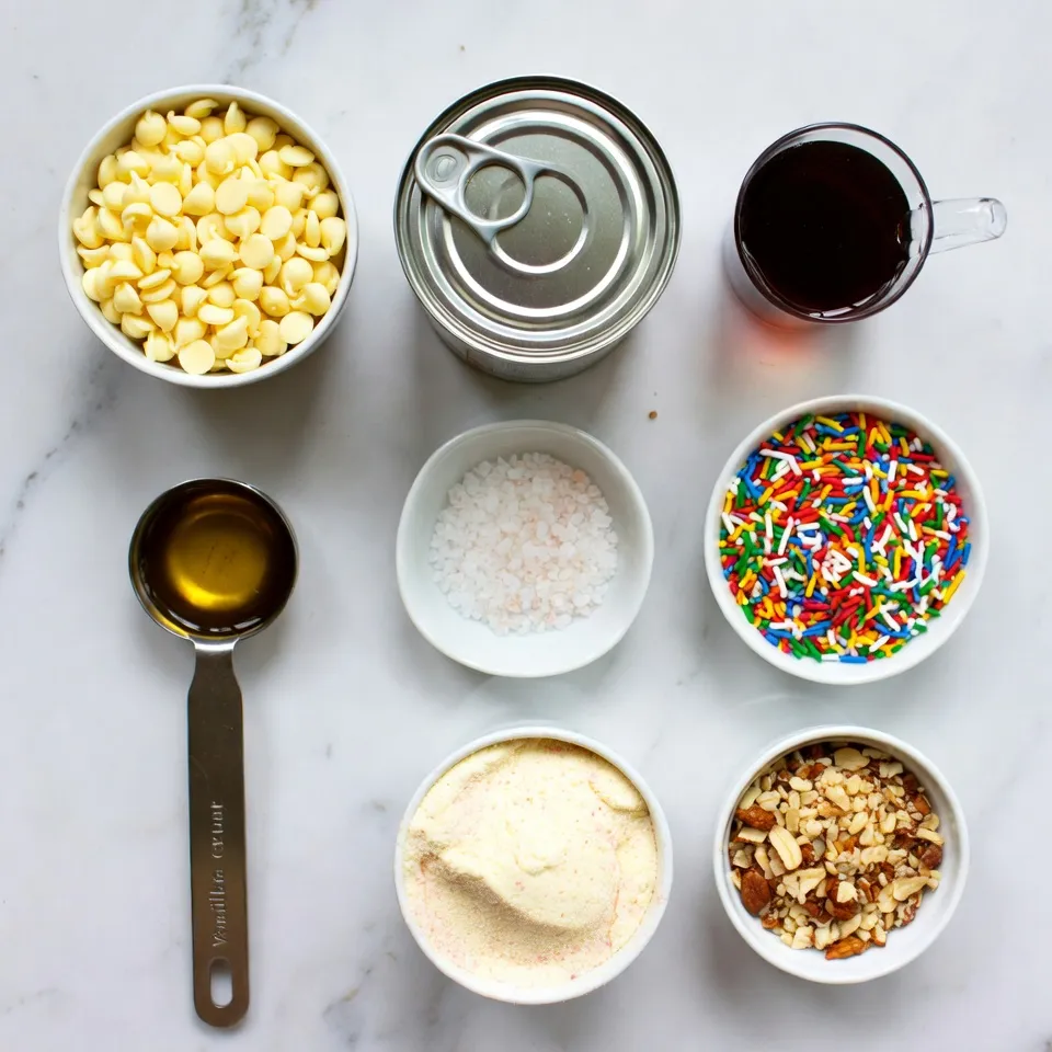 These main ingredients create a creamy base for the fudge. The white chocolate chips melt smoothly. Sweetened condensed milk adds rich sweetness. Vanilla extract gives a lovely flavor. Sea salt balances the sweetness perfectly.
