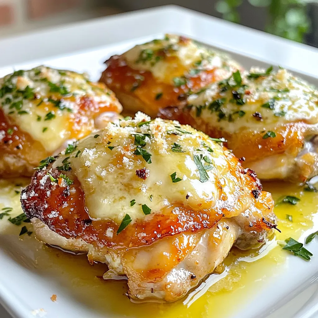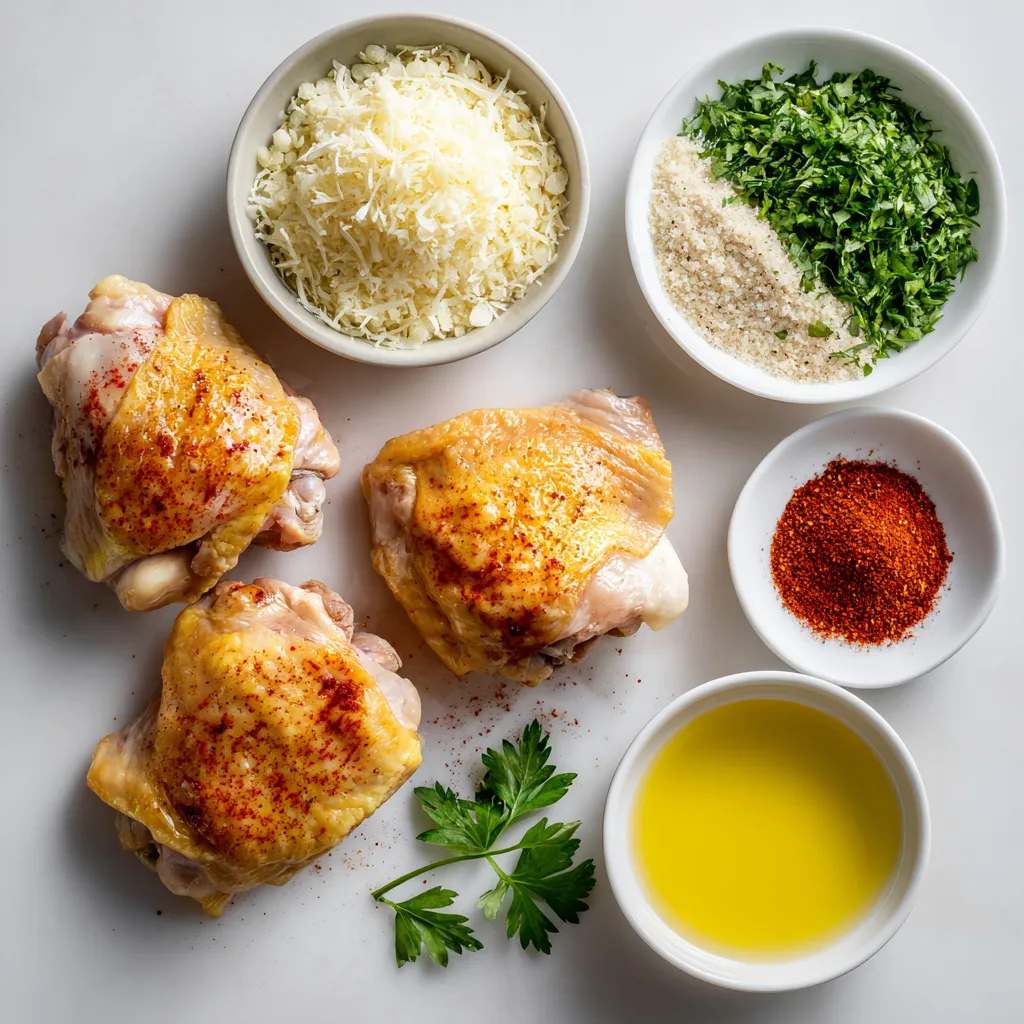 The main ingredients for this dish are simple yet flavorful. The chicken thighs provide rich taste and moisture. Garlic adds a strong aroma and depth. Parmesan cheese brings a savory kick that makes each bite special.