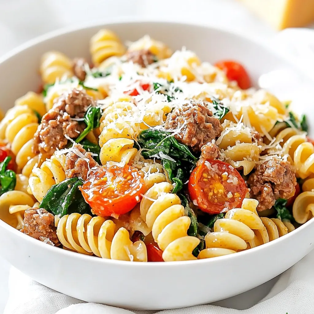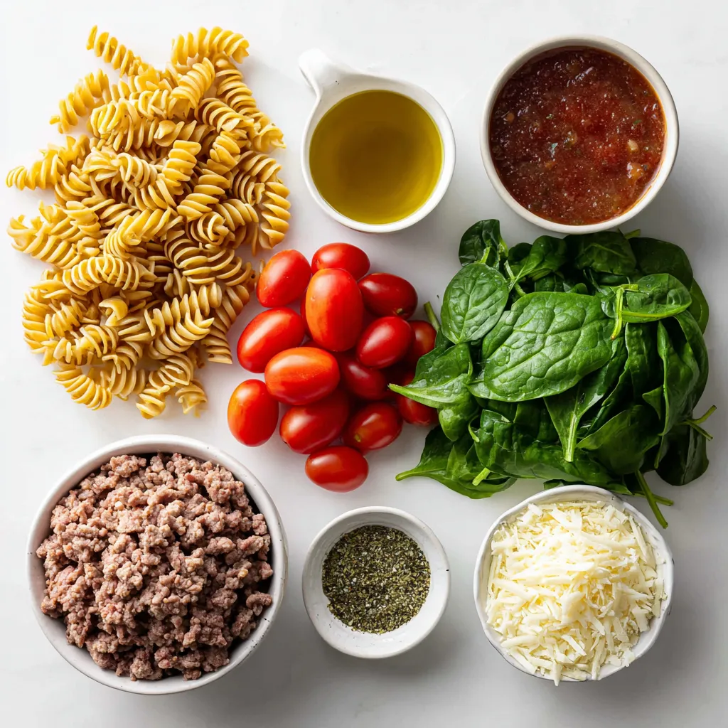 The main ingredients in this dish are simple yet packed with flavor and nutrients. Whole wheat pasta gives you fiber and keeps you full. Lean ground beef adds protein. Cherry tomatoes and spinach bring freshness and color.