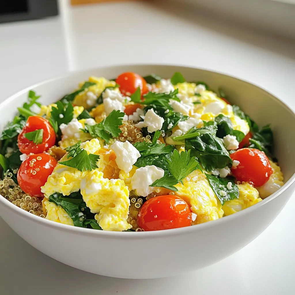 To make high protein egg white scramble bowls, gather these simple ingredients. Egg whites are the star, providing protein without the fat. Spinach adds green goodness and nutrients. Cherry tomatoes offer a sweet burst and color. Red bell pepper gives crunch and flavor. Low-fat feta cheese adds creaminess and a tangy kick. Quinoa brings in extra protein and fiber. Fresh parsley adds a pop of color and taste. Olive oil helps cook the veggies and adds a lovely richness. Don’t forget salt and pepper to enhance all the flavors. If you like a little heat, keep some hot sauce handy! This mix creates a healthy breakfast that keeps you full and happy.