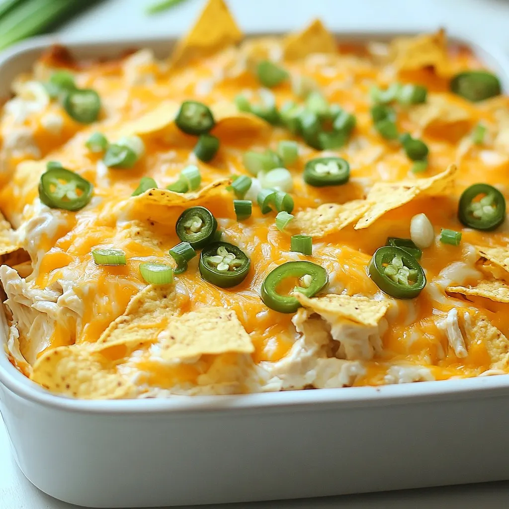 A creamy and cheesy casserole featuring shredded chicken, jalapeños, and a crunchy tortilla chip topping.