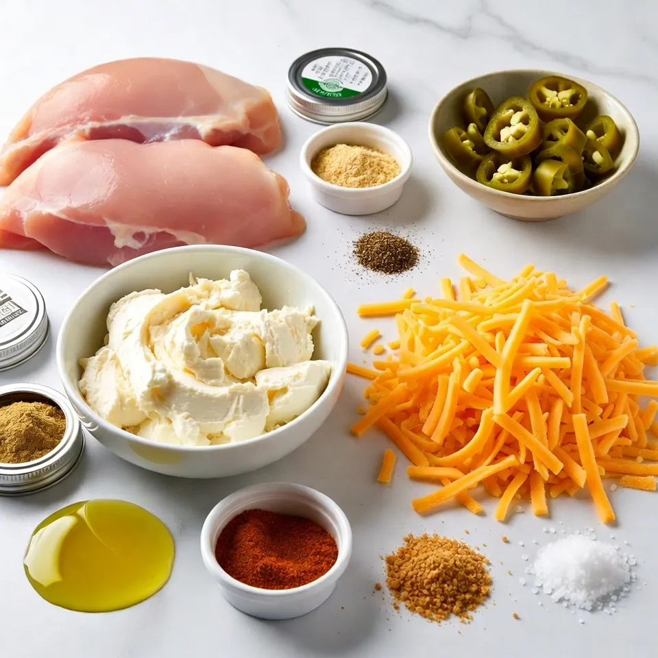 To make Jalapeño Popper Stuffed Chicken, you need fresh, quality ingredients. The chicken breasts should be boneless and skinless. This makes them easy to stuff and cook. Cream cheese adds a rich, creamy texture. Sharp cheddar cheese gives a nice punch of flavor. Jalapeños deliver that spicy kick. You can use fresh or pickled jalapeños based on your taste.