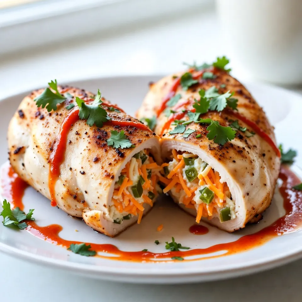 For an elegant presentation, slice the stuffed chicken breasts diagonally and drizzle with sriracha.