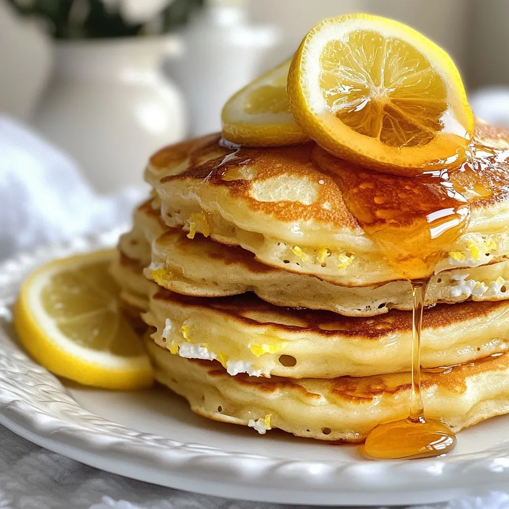 - 1 cup ricotta cheese - 1 cup all-purpose flour - 2 tablespoons granulated sugar - 2 teaspoons baking powder - 1/2 teaspoon baking soda - 1/4 teaspoon fine salt - 2 large eggs - 1/4 cup milk - Zest of 1 large lemon - Juice of 1 large lemon - 1 teaspoon pure vanilla extract - Butter or cooking oil for greasing the skillet - Maple syrup or honey for serving These ingredients come together to create light and fluffy pancakes. The ricotta cheese adds a creamy texture. The lemon zest and juice give a bright, zesty flavor that makes these pancakes special. - Maple syrup - Honey - Fresh fruits like berries or banana slices - Whipped cream Toppings make your pancakes even better. Maple syrup adds sweetness. Fresh fruits bring color and flavor. You can mix and match toppings to suit your taste. - Use dairy-free ricotta for a vegan option. - Substitute all-purpose flour with oat flour or almond flour. - Swap milk with almond milk or oat milk. Substitutions can help you cater to different diets. These options keep the taste and texture close to the original. You can enjoy lemon ricotta pancakes, no matter your dietary needs. {{ingredient_image_2}} In a medium mixing bowl, combine the following: - 1 cup ricotta cheese - 2 large eggs - 1/4 cup milk - Juice of 1 large lemon - Zest of 1 large lemon - 1 teaspoon pure vanilla extract Use a fork or whisk to blend these ingredients until smooth and creamy. This creamy mix is the base for your pancakes. The ricotta adds a nice texture, while the lemon gives a fresh taste. In a separate large bowl, whisk together these dry ingredients: - 1 cup all-purpose flour - 2 tablespoons granulated sugar - 2 teaspoons baking powder - 1/2 teaspoon baking soda - 1/4 teaspoon fine salt Make sure to mix them well. This helps the pancakes rise and gives them a nice, even flavor. Now, carefully pour the wet mixture into the bowl with the dry ingredients. Use a spatula to gently fold the two mixtures together. Stop mixing when just combined. It’s alright if the batter is a bit lumpy; this helps keep the pancakes fluffy. Next, preheat a non-stick skillet or griddle over medium heat. Once it’s hot, add a small amount of butter or oil. This will help the pancakes release easily. For each pancake, pour about 1/4 cup of batter onto the skillet. Cook until small bubbles form on the surface. This takes about 3-4 minutes. The edges should look set. Carefully flip the pancake and cook for another 2-3 minutes, until golden brown. Once cooked, transfer the pancakes to a plate and cover them lightly with a kitchen towel to keep warm. Repeat with the rest of the batter, adding more butter or oil as needed. Enjoy your fluffy lemon ricotta pancakes! To make your pancakes fluffy, do not overmix the batter. When you combine the wet and dry ingredients, use a spatula to gently fold them together. This keeps air in the batter, making your pancakes light. A few lumps in the batter are okay. Remember, overmixing makes the pancakes dense and tough. Accurate measurement of ingredients is key. Use dry measuring cups for flour and sugar. For liquids like milk, use a liquid measuring cup. Spoon flour into your measuring cup and level it off with a knife. This avoids packing it down and ensures you don’t use too much. Cook your pancakes on medium heat. This gives them time to cook through without burning. If the heat is too high, the outside will brown before the inside is done. You want a nice golden brown color on each side. Adjust the heat as needed to keep perfect pancakes coming! Pro Tips Use Fresh Ingredients: For the best flavor, use fresh lemon juice and zest. This will enhance the brightness of the pancakes. Don’t Overmix: When combining the wet and dry ingredients, mix just until combined. Overmixing can lead to dense pancakes. Keep the Skillet at the Right Temperature: Make sure your skillet is preheated to medium heat before cooking. Too hot, and the pancakes will burn; too cool, and they won’t cook through. Try Add-Ins: Experiment with adding blueberries or chocolate chips to the batter for a delicious twist on the classic recipe. {{image_4}} You can add fun flavors to your lemon ricotta pancakes. Blueberries make a great choice. Just fold in about a cup of fresh or frozen blueberries into the batter. Chocolate chips also work well for a sweet twist. Use about half a cup for a rich treat. These additions give your pancakes extra taste and texture, making each bite special. If you want to make these pancakes gluten-free, swap the all-purpose flour with a gluten-free blend. For a vegan version, replace the ricotta cheese with a plant-based alternative. Use flax eggs instead of regular eggs; mix one tablespoon of ground flaxseed with three tablespoons of water for each egg. These swaps let everyone enjoy the fluffy goodness of these pancakes. Get creative by adding spices or other fruits. Try using orange zest instead of lemon for a bright flavor. A hint of cardamom or cinnamon can add warmth and depth. You can also incorporate coconut for a tropical vibe or even some matcha for a green twist. Each option brings a new taste, making your pancakes exciting and unique. To keep your lemon ricotta pancakes fresh, store them in an airtight container. Place parchment paper between layers to avoid sticking. Refrigerate the pancakes for up to three days. This way, they stay soft and tasty. To freeze pancakes, let them cool completely first. Stack them with parchment paper in between. Place the stack in a freezer bag, and remove as much air as you can. You can freeze them for up to two months. When you want to enjoy them, just take out the number you need. You can reheat pancakes in two easy ways: - Microwave: Place pancakes on a microwave-safe plate. Heat them for about 30 seconds to 1 minute. Check to make sure they are warm all the way through. - Stovetop: Warm a non-stick skillet over low heat. Add the pancakes one by one. Heat for about 1-2 minutes on each side. This keeps them nice and