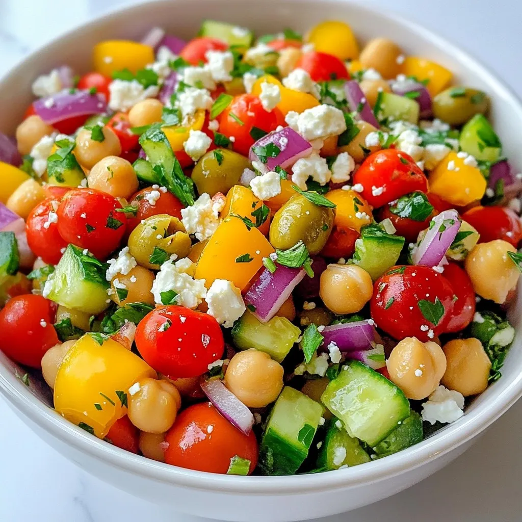 A vibrant and refreshing salad featuring chickpeas, fresh vegetables, and a zesty dressing.
