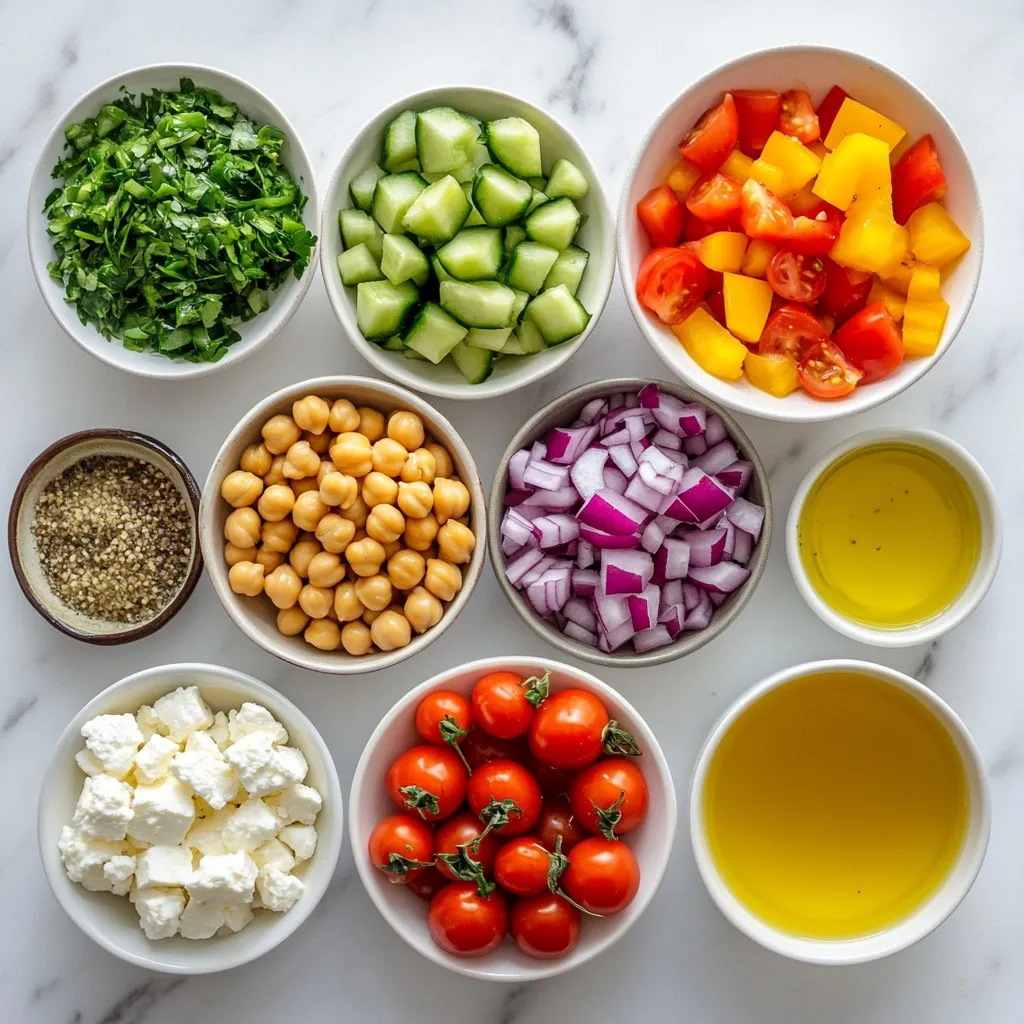 This salad comes alive with fresh, vibrant flavors. Each ingredient plays a key role. The chickpeas provide protein and fiber, making this dish hearty. Cherry tomatoes add a sweet burst, while cucumber gives a nice crunch. The bell pepper adds color and flavor, and red onion adds a slight zing.