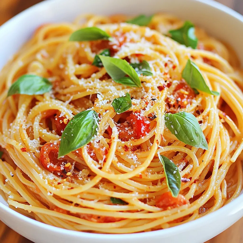 To make this tasty dish, you need just a few key items: - 200g spaghetti or your pasta of choice - 3 tablespoons extra virgin olive oil - 4 cloves of garlic, thinly sliced - 400g canned diced tomatoes (preferably Italian) - 1 teaspoon red pepper flakes (adjust to taste for heat) - 1 teaspoon dried oregano - Salt and freshly ground black pepper to taste - Fresh basil leaves, for garnish - Grated Parmesan cheese (optional, for serving) These ingredients create a bright and flavorful sauce. The garlic adds depth, while the tomatoes bring freshness. The red pepper flakes give it just the right kick. If you want to step up the flavor, consider these extras: - A splash of balsamic vinegar for sweetness - Olives or capers for briny notes - Spinach or arugula for a fresh touch - Lemon zest for brightness - Crushed nuts for crunch These additions can transform the dish. They add layers of taste and texture that make your meal unique. Not all ingredients need to be set in stone. Here are some swaps: - Use whole wheat or gluten-free pasta for dietary needs - Substitute garlic with shallots for a milder taste - Swap canned tomatoes for fresh ones during peak season - Use fresh herbs instead of dried for a vibrant flavor - Opt for nutritional yeast instead of Parmesan for a vegan option Feel free to mix and match! Cooking is about making it work for you. Use what you have and enjoy the process! {{ingredient_image_2}} Start by boiling a large pot of salted water. This step is key for good flavor. When the water boils, add 200g of spaghetti or your favorite pasta. Cook it according to the package instructions. Aim for al dente, which means firm but not hard. Reserve ½ cup of the starchy water before draining the pasta. Set it aside while you make the sauce. In a large skillet, heat 3 tablespoons of extra virgin olive oil over medium heat. Once the oil shimmers, add 4 thinly sliced garlic cloves. Sauté them for 1-2 minutes. Stir them often to avoid burning. You want the garlic to smell great and turn a light golden color. Burning the garlic can make your dish bitter, so keep an eye on it. Pour in 400g of canned diced tomatoes. I prefer using Italian tomatoes for their rich flavor. Stir to combine the tomatoes with the garlic. Let the mixture simmer gently for about 5 minutes. This simmering time helps the flavors blend. After that, add 1 teaspoon of red pepper flakes and 1 teaspoon of dried oregano. Season with salt and freshly ground black pepper to your taste. If the sauce seems thick, add some reserved pasta water until it’s just right. Now that your pasta is ready, add it directly into the skillet. Toss the pasta with the tomato-garlic sauce until it’s well coated. If it looks dry, pour in more of the reserved pasta water. This helps the sauce cling better to the pasta. Make sure everything is mixed well. Serve your pasta hot. For a beautiful finish, garnish with fresh basil leaves. If you want to add extra flavor, sprinkle some grated Parmesan cheese on top. Plate the pasta in shallow bowls, twirling it into neat nests. Drizzle a bit more olive oil over the top and add a few whole basil leaves for a pop of color. Enjoy your Minute Tomato Garlic Pasta! To cook pasta just right, follow these steps: - Use a large pot with plenty of water. - Add a lot of salt; it should taste like the sea. - Bring the water to a rolling boil before adding pasta. - Stir the pasta after adding it to prevent sticking. - Cook until al dente, which means it should still have a slight bite. - Save half a cup of pasta water before draining. This water helps bind the sauce later. Garlic is key for great taste. Here’s how to use it: - Slice fresh garlic thinly for a stronger flavor. - Cook it in olive oil over medium heat. - Watch it closely; cook until it’s light golden, about 1-2 minutes. - If it burns, the taste turns bitter. - Don’t rush this step! Good garlic adds depth to the sauce. Want to control the heat? Here’s what to do: - Start with one teaspoon of red pepper flakes. - Taste the sauce as you cook. - If you want more heat, add more flakes slowly. - Remember, you can always add, but can’t take away! - For milder flavors, skip the red pepper or use less. Pro Tips Use High-Quality Olive Oil: A good quality extra virgin olive oil will not only enhance the flavor of the dish but also add a rich, aromatic finish to the pasta. Don't Overcook the Pasta: Aim for al dente, as the pasta will continue to cook slightly when mixed with the sauce. This will help maintain its texture. Customize the Heat Level: Adjust the amount of red pepper flakes according to your taste preference. Start with a small amount and increase as needed. Reserve Pasta Water: The starchy reserved pasta water is a great way to adjust the consistency of the sauce and helps it cling better to the pasta. {{image_4}} To make creamy tomato garlic pasta, add ½ cup of heavy cream or half-and-half. Stir it in after you simmer the tomato sauce. This gives the dish a rich, smooth texture. The cream balances the acid from the tomatoes. I love this variation for a cozy dinner. Want to boost the nutrition? Add vegetables! Spinach, zucchini, or bell peppers work well. Sauté them with the garlic for extra flavor. You can also toss in some cooked mushrooms. They add earthiness and depth to the dish. This makes the pasta not just tasty, but also colorful and healthy. For a filling meal, consider adding protein. Grilled chicken or shrimp pairs perfectly with the sauce. Simply cook them separately and toss them in at the end. If you prefer meatless options, try chickpeas or lentils. They add texture and keep you satisfied. Enjoy the flavors while making it a complete meal! After enjoying your Minute Tomato Garlic Pasta, store any leftovers in a sealed container. Let the pasta cool down to room temperature before sealing it. Keep it in the fridge for up to three days. Make sure to label the container with the date to keep track. When you want to eat the lef