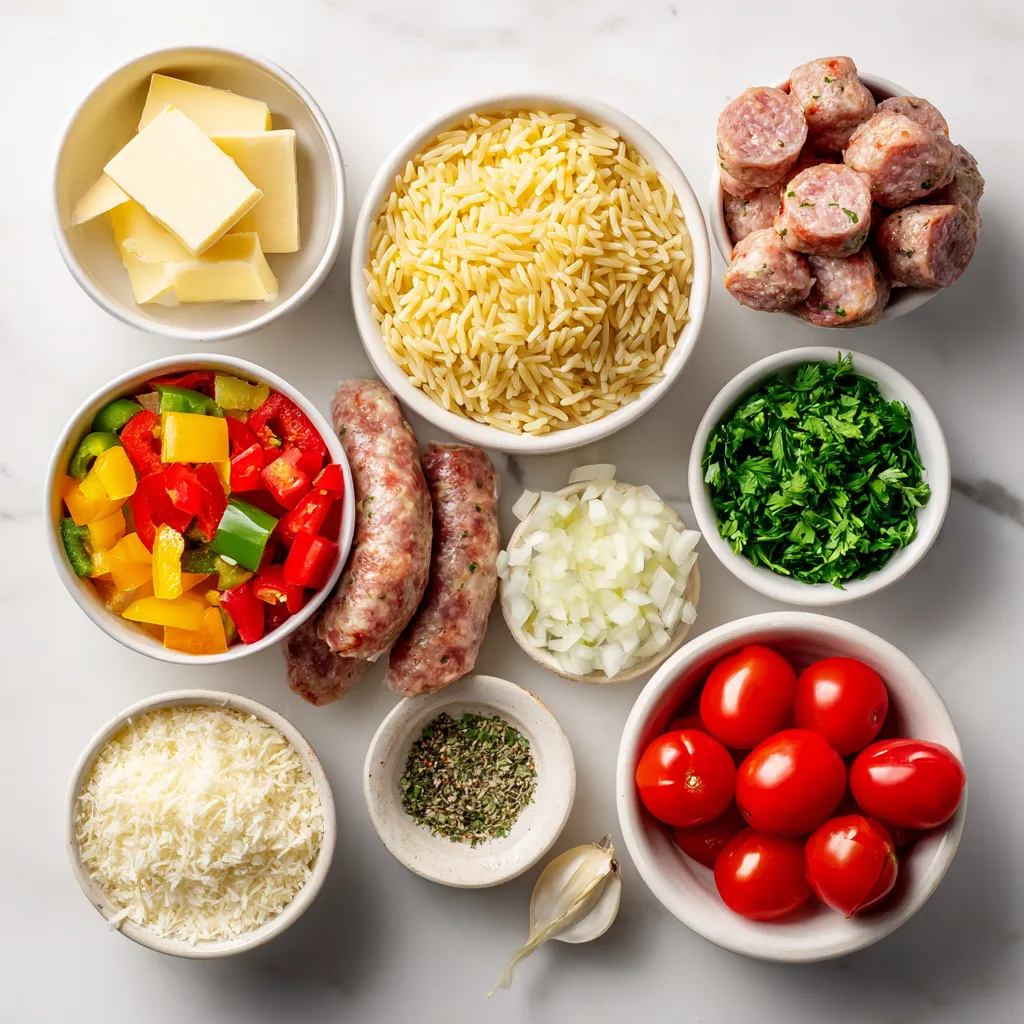 To make this One-Pot Garlic Butter Sausage Orzo, you need simple and fresh ingredients. The Italian chicken sausage gives the dish its rich flavor. You can choose any color of bell pepper for a bright touch. The orzo pasta cooks perfectly in the broth, soaking up all the tasty juices.