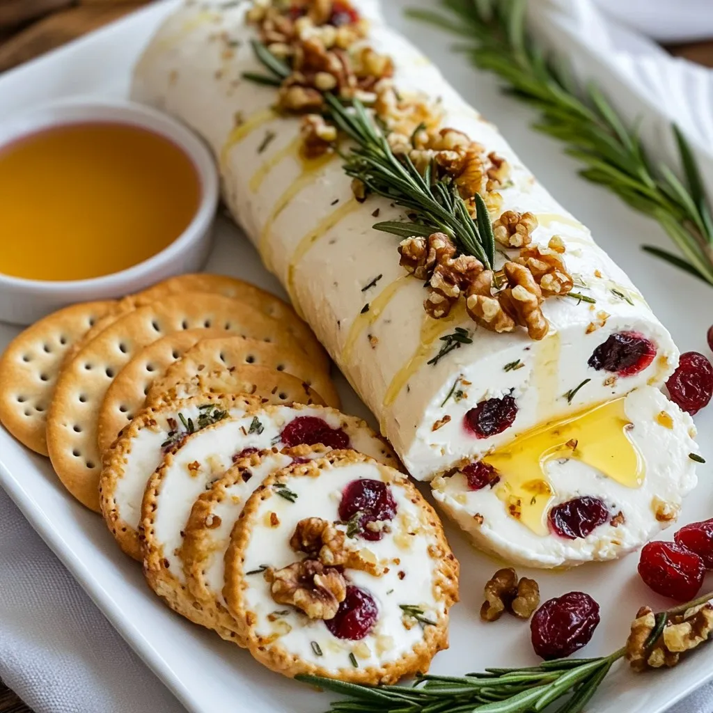 A creamy and flavorful goat cheese log infused with dried cranberries, walnuts, and fresh rosemary, perfect for entertaining.