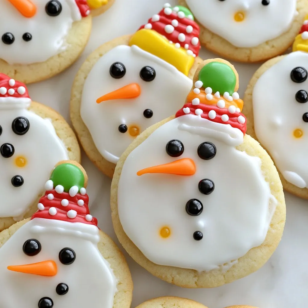 Delicious sugar cookies shaped like snowmen, perfect for holiday celebrations.