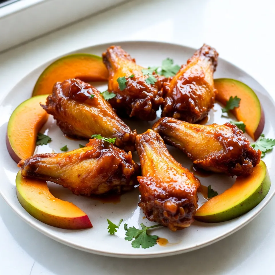 Deliciously spicy chicken wings coated in a sweet mango marinade, perfect for any gathering.