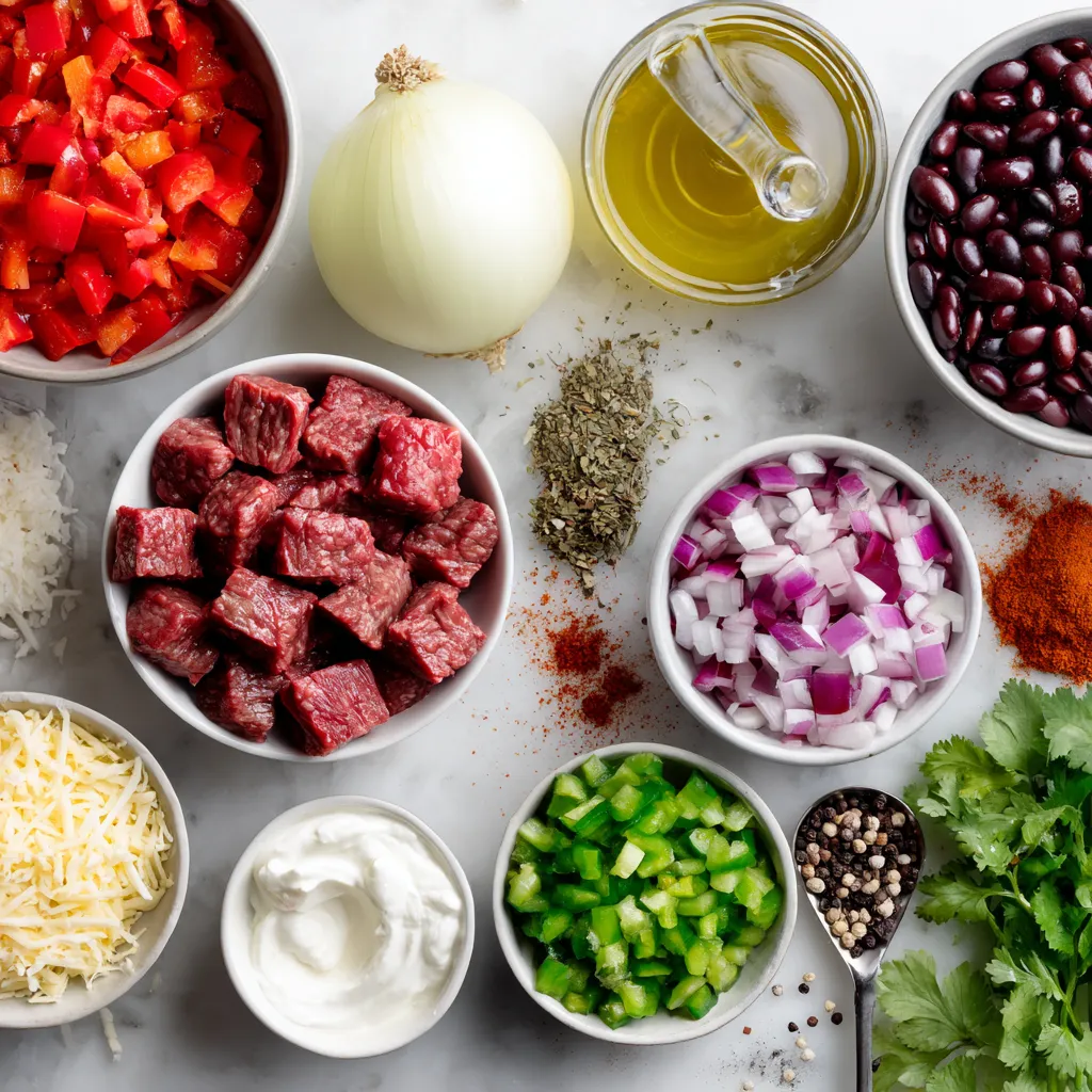 - 1 lb sirloin steak, cut into bite-sized cubes - 1 tablespoon olive oil - 1 large onion, finely diced - 3 cloves garlic, minced - 1 red bell pepper, chopped - 1 green bell pepper, chopped - 2 jalapeño peppers, finely minced The main ingredients create a rich base for the chili. I love using sirloin steak for its great flavor and tenderness. Olive oil helps to brown the steak nicely. The onion and garlic add depth and aroma. Bell peppers bring sweetness and color. Jalapeños give that spicy kick, which you can adjust based on your taste. - 1 can (14 oz) diced tomatoes with their juices - 1 can (15 oz) kidney beans, drained and rinsed - 1 can (15 oz) black beans, drained and rinsed Canned ingredients make this chili easy and quick. Diced tomatoes add moisture and flavor. Kidney beans and black beans provide protein and fiber. They also help to thicken the chili and create a hearty texture. - 2 tablespoons chili powder - 1 teaspoon ground cumin - 1 teaspoon smoked paprika - ½ teaspoon cayenne pepper (optional, adjust to taste) - Salt and pepper to taste Spices are key to making chili special. Chili powder gives a classic taste. Ground cumin adds warmth and earthiness. Smoked paprika brings a hint of smokiness. Cayenne pepper is perfect for those who love heat. Don’t forget to season with salt and pepper to enhance all the flavors. {{ingredient_image_2}} To start, heat olive oil in a large pot over medium-high heat. I like to use a Dutch oven for even cooking. Once the oil shimmers, add your cubed sirloin steak. Sauté the steak for about 5-7 minutes. Stir it often to get it brown on all sides. This browning step adds deep flavor to your chili. Once browned, take the steak out and set it aside on a plate. Next, keep the pot hot and add the diced onion. Cooking the onion for about 3-4 minutes helps it soften and turn translucent. Then, add minced garlic and cook for another 30 seconds. This step is vital as it builds a rich flavor base for your chili. Now, it’s time to add the fun ingredients! Toss in the chopped red and green bell peppers and minced jalapeños. Sauté these for about 5 minutes until tender. Return the browned steak to the pot. Now, pour in the diced tomatoes with their juices, kidney beans, and black beans. Sprinkle in chili powder, ground cumin, smoked paprika, and cayenne pepper. Mix everything well. Next, pour in the beef broth and bring it to a boil. Lower the heat and cover the pot, letting it simmer for 30-40 minutes. Stir it occasionally to blend the flavors. After simmering, taste the chili and adjust with salt or cayenne if you want more heat. Finally, serve the hot chili in bowls. Garnish with fresh cilantro and, if you like, add a dollop of sour cream or shredded cheese. Enjoy this hearty comfort food! To get the best flavor, start with fresh ingredients. Use quality sirloin steak for the best taste. Sauté the steak until it is browned. This step adds depth to your chili. Next, cook the onion and garlic together. This mix builds a rich base flavor. When adding peppers, chop them evenly. This helps them cook at the same rate. Stir the chili often while it simmers. This prevents sticking and helps blend the flavors. Garnish your chili with fresh cilantro. The bright flavor adds a nice touch. You can also sprinkle shredded cheese on top. This adds creaminess and texture. Serve the chili with crusty bread or cornbread. These sides soak up the delicious sauce. For a refreshing twist, add lime wedges. A squeeze of lime brightens the dish. To change the heat, use more or fewer jalapeños. If you want a milder chili, remove the seeds. For more heat, add more cayenne pepper. You can also try different peppers. Poblano or serrano peppers can add flavor and heat. Each pepper brings its unique taste. Adjust spice levels to match your preference. This way, everyone can enjoy the chili. Pro Tips Choose Your Cut Wisely: For a tender and juicy chili, opt for well-marbled cuts like sirloin or chuck. They hold up well during the long cooking process. Layer the Flavors: Don’t rush the sautéing step! Taking the time to properly brown the meat and cook the vegetables will enhance the overall flavor of your chili. Adjust the Heat: If you prefer a milder chili, remove the seeds and membranes from the jalapeños before chopping. For more heat, include the seeds or add extra cayenne pepper. Let It Rest: For the best flavor, allow your chili to cool and then refrigerate it overnight. The flavors will meld beautifully, making it even tastier the next day! {{image_4}} If you want a meat-free chili, you can easily switch out the steak. I suggest using hearty ingredients that pack flavor. Try using: - 1 lb of mushrooms, diced - 1 cup of lentils - 1 cup of chopped zucchini - 1 cup of corn Beans are great too! I love using: - 1 can of kidney beans - 1 can of chickpeas These options give a nice texture and taste. They make the chili rich and filling without meat. You can make this chili in different ways. The stovetop is quick and easy, but a slow cooker makes it even better. For stovetop: - Brown the steak and sauté the veggies as usual. - Then let it simmer for about 30-40 minutes. With a slow cooker, do this: - Brown the steak first. - Add everything to the slow cooker and cook on low for 6-8 hours. The Instant Pot is a fun option too! Just: - Use the sauté setting for the steak and veggies. - Add all the ingredients and cook on high pressure for 15 minutes. Each method gives a unique flavor to your chili! Chili varies a lot by region. In some places, you might find unique spices. For example: - In Texas, they use more chili powder and less tomato. - In the Southwest, cumin and coriander add depth. Traditional toppings are also key. Here are some favorites: - Diced onions - Fresh jalapeños - Avocado slices These toppings enhance the chili and add a fresh touch. Try mixing and matching to find your favorite spin! To keep your chili fresh, store it in an airtight container. This he