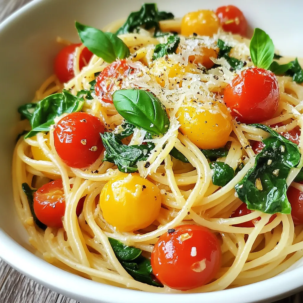 - 8 oz whole wheat spaghetti - 2 cups fresh spinach, thoroughly washed and roughly chopped - 2 cups cherry tomatoes, halved - 3 cloves garlic, finely minced - 1/4 cup extra virgin olive oil - 1 teaspoon red pepper flakes (adjust for heat preference) - 1/4 cup fresh basil leaves, chopped - 1/4 cup grated Parmesan cheese (optional, for serving) - Zest of 1 lemon (freshly grated) For this Spinach Tomato Pasta, I love using whole wheat spaghetti. It adds a nice, nutty flavor. Fresh spinach is a must; it wilts down perfectly and brings a vibrant color. Cherry tomatoes burst with juice, adding sweetness to the dish. Garlic is my go-to aromatic. It brings depth and a lovely scent. Extra virgin olive oil not only helps sauté but also adds a fruity taste. Red pepper flakes give the pasta a nice kick. You can adjust this to your heat preference. For garnishes, I love fresh basil. It adds a bright note that pairs well with the tomatoes. If you want more richness, sprinkle some grated Parmesan cheese on top. A touch of lemon zest brightens the dish and makes it vibrant. Each ingredient plays a role in making this pasta simple yet flavorful. {{ingredient_image_2}} 1. Start by bringing a large pot of salted water to a boil. 2. Add 8 oz of whole wheat spaghetti. Cook it according to the package instructions, about 8-10 minutes until it is al dente. 3. Before draining, reserve about 1/2 cup of the starchy pasta water. Drain the spaghetti and set it aside. 1. In the same pot, heat 1/4 cup of extra virgin olive oil over medium heat. 2. Once the oil is hot, add 3 cloves of minced garlic. Sauté for about 1 minute. Stir it all the time. This keeps the garlic from burning. 1. Add 2 cups of halved cherry tomatoes to the pot. Cook them for about 5-7 minutes. Stir occasionally. The tomatoes will blister and soften, releasing their juices. 2. Next, add 2 cups of chopped spinach, 1 teaspoon of red pepper flakes, 1/2 teaspoon of salt, and 1/2 teaspoon of black pepper. Sauté for another 2-3 minutes. Stir until the spinach wilts and mixes well with the tomatoes. 1. Now, gently add the drained spaghetti back into the pot. 2. Slowly add the reserved pasta water, tossing the pasta with the sauce. This creates a light sauce that coats the spaghetti nicely. 1. Stir in 1/4 cup of chopped fresh basil and the zest of 1 lemon. Taste and adjust the seasoning if you like. 2. If you want, sprinkle with 1/4 cup of grated Parmesan cheese for extra flavor. 3. Serve the pasta in individual bowls. Garnish with more basil and a drizzle of olive oil for a lovely finish. - Alternatives for whole wheat spaghetti: You can use gluten-free pasta if needed. Zucchini noodles or spaghetti squash work well too. These choices keep it light and fresh. - Vegan options for Parmesan cheese: Nutritional yeast gives a cheesy flavor without dairy. Cashew cheese is another tasty choice that adds creaminess. - Tips for perfectly sautéed garlic and tomatoes: Heat the olive oil until it shimmers. Add minced garlic and stir for one minute. This keeps the garlic from burning and tasting bitter. Then, add the tomatoes and cook until they blister. - Ensuring al dente pasta: Follow the package instructions but test the pasta a minute early. It should be firm yet tender. Reserve some pasta water to help the sauce stick. - Additional herbs and spices: Try adding oregano or thyme for extra depth. A pinch of smoked paprika can add a nice kick. Fresh herbs boost the taste even more. - Serving temperature and presentation advice: Serve the pasta hot in deep bowls. Garnish with fresh basil and a drizzle of olive oil. A sprinkle of lemon zest brightens the dish and makes it look appealing. Pro Tips Fresh Spinach: Using fresh spinach instead of frozen not only enhances the flavor but also adds a vibrant color to your dish. Perfect Pasta: Make sure to cook the spaghetti al dente to achieve the perfect texture that holds up well with the sauce. Flavor Boost: For an extra flavor boost, consider adding a splash of balsamic vinegar when sautéing the tomatoes. Garnish Smart: Garnish with a squeeze of lemon juice just before serving to brighten the flavors and enhance the dish. {{image_4}} You can add protein to your Spinach Tomato Pasta easily. Grilled chicken adds great flavor and texture. Simply season the chicken and grill until cooked. Slice it and toss it on top of your pasta. If you prefer seafood, shrimp works well too. Sauté shrimp in olive oil until they turn pink and add them to your dish. For plant-based options, try chickpeas or tofu. Both options pack a protein punch and absorb flavors well. Feel free to swap in different veggies. Other leafy greens like kale or Swiss chard can replace spinach. They add similar nutrients and taste. You can also use seasonal vegetables. Bell peppers bring color and sweetness, while zucchini adds nice texture. Just slice and sauté them with the garlic and tomatoes for an extra veggie boost. If you need gluten-free options, use gluten-free pasta. Many brands offer tasty alternatives made from rice or quinoa. For lower-calorie substitutes, limit the olive oil or use less cheese. You can skip the cheese altogether and still enjoy great flavor. Adding more veggies can also help you keep the meal light. To store leftover pasta, let it cool first. Place the pasta in an airtight container. This keeps it fresh longer. You can store it in the fridge for up to three days. If you want, add a little olive oil to keep it moist. Best practices for maintaining freshness include keeping the sauce separate if possible. This helps avoid sogginess. When you store pasta with sauce, it can clump together. If you have extra toppings like cheese, keep them in a separate container. For quick reheating, you can use a microwave or a stovetop. If you choose the microwave, cover the pasta with a damp paper towel. This keeps the moisture in. Heat in short bursts, stirring in between. If you use the stovetop, add a splash of water to a pan. Heat the past