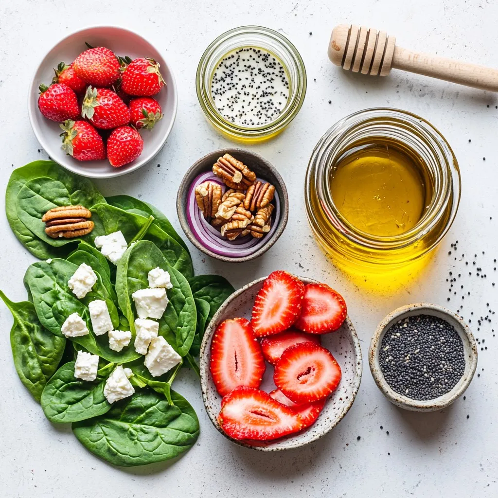 The ingredients in this salad bring a burst of color and flavor. You start with fresh spinach leaves. They form a healthy base for your salad. The strawberries add natural sweetness. Their bright red color makes the dish inviting.