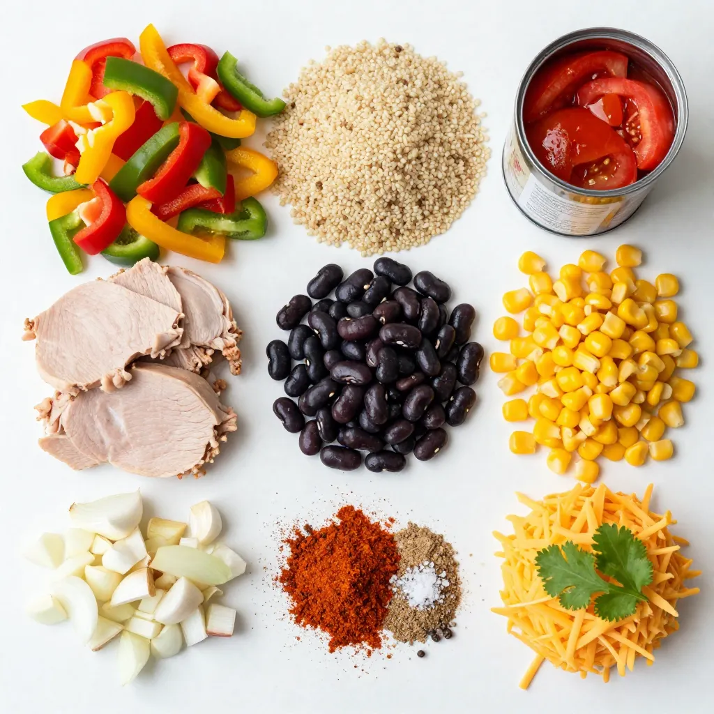 When choosing bell peppers, pick ones that feel firm. They should have a shiny skin. For ground meat, lean turkey or beef works best. Rinse quinoa or rice well to remove any bitter taste. Drain the diced tomatoes to keep the dish from being too wet. Rinsing black beans removes extra sodium. Chop the onion and garlic into small pieces to blend well in the dish.