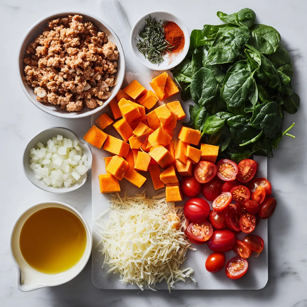 The main ingredients in this bake create a bright and tasty dish. Ground turkey gives protein while sweet potatoes add sweetness and creaminess. The spinach and tomatoes boost color and nutrients. Onions and garlic add depth of flavor, making each bite satisfying.